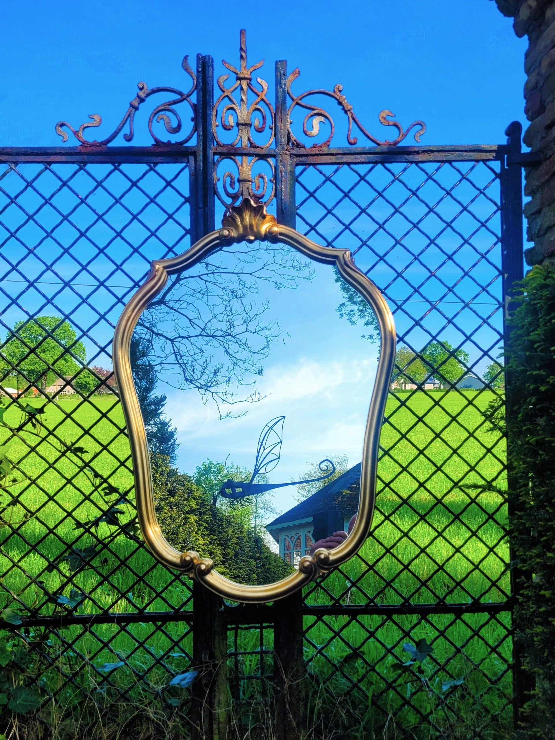 Spiegels horen in het interieur maar buiten misstaan ze beslist ook niet. (Onze teakhouten dieren hebben overigens belangeloos hun medewerking verleend aan de ‘spiegel-foto sessies’).